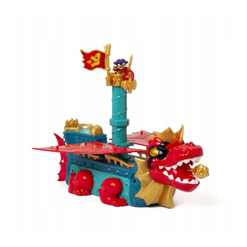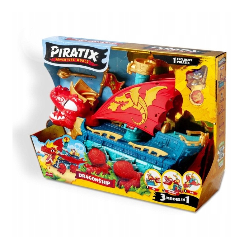 Smoczy statek może żeglować po Siedmiu Morzach dzięki opływowemu kadłubowi i mocnemu sterowi ogonowemu – poruszaj nim, aby sterować nim po wodzie w poszukiwaniu nowych przygód. Ląd w zasięgu wzroku?Użyj ekskluzywnej waluty, aby przekształcić go w smoka i poruszać się po plaży lub dżungli. A gdy tylko zdobędziesz skarb, rozwiń skrzydła i leć! Pamiętaj, że w razie jakiegokolwiek niebezpieczeństwa możesz wystrzelić pocisk w formie ognia z lufą ukrytą między jego szczękami. Umieść swoje Piratixy na całym smoczym statku i poprowadź je do nowych przygód i skarbów!