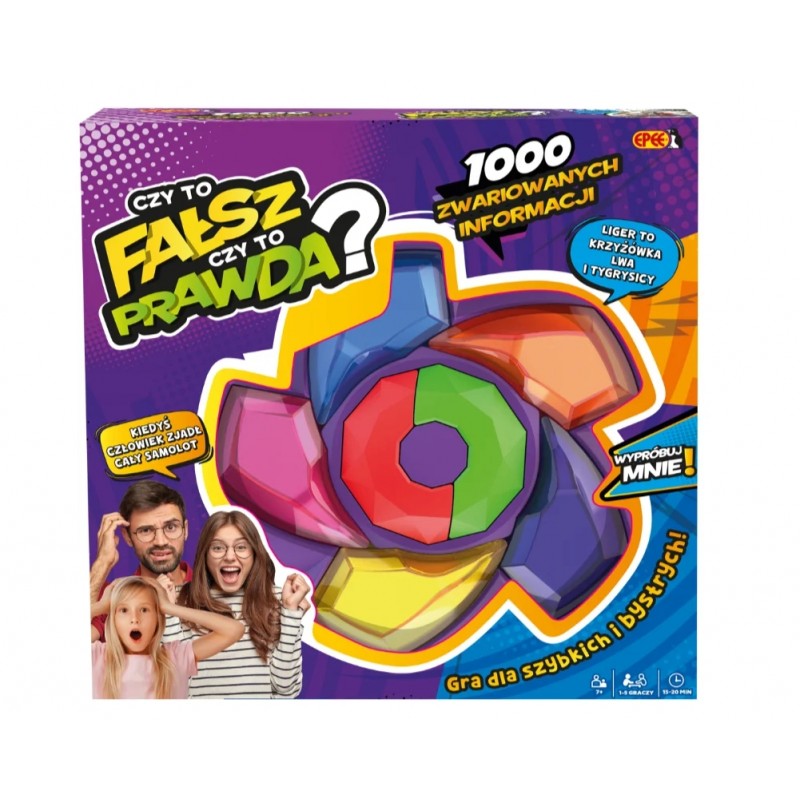 Czy to fałsz, czy to prawda? to gra, która zbliża pokolenia – dzieci, rodzice i dziadkowie mogą wspólnie śmiać się, uczyć i rywalizować. Doskonała na rodzinne wieczory, imprezy czy podróż. Proste zasady sprawiają, że każdy może od razu dołączyć do zabawy, a każda runda to nowe zaskoczenie i salwy śmiechu. To idealny sposób na wspólne spędzanie czasu pełne radości i dobrej energii.